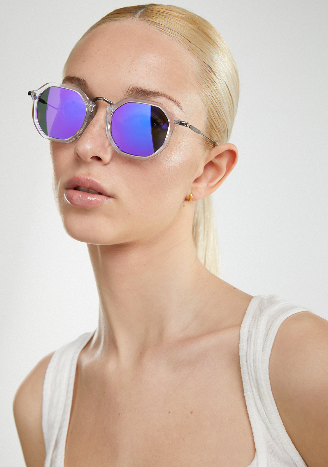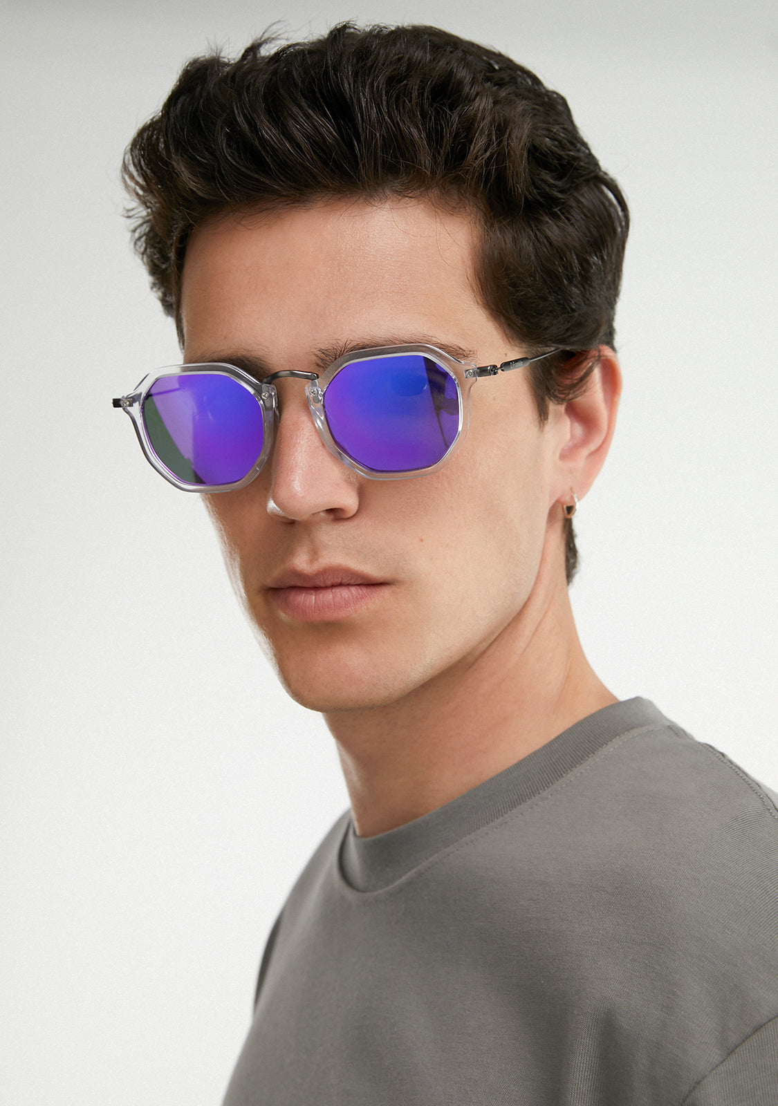 Polycarbonat-Linsen und ein klarer, achteckiger Kontur verstärken den ikonischen Stil. Sie verfügt über unsere charakteristischen D.Franklin-Details: das Logo, das auf beiden Metallbügeln eingraviert ist, und unser Emblem auf der rechten Linse. Mit einer Linsenbreite von 51 mm und einem vorderen Rahmen von 148 mm betonen diese Brillen die Merkmale jedes Gesichts. Die Seitenteile aus rostfreiem Stahl sind 145 mm lang.