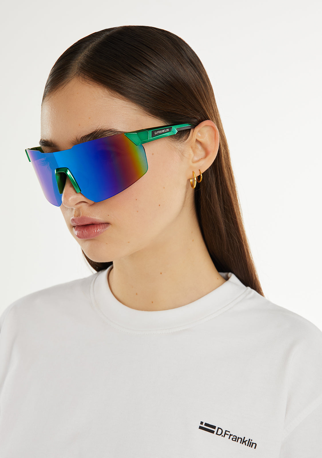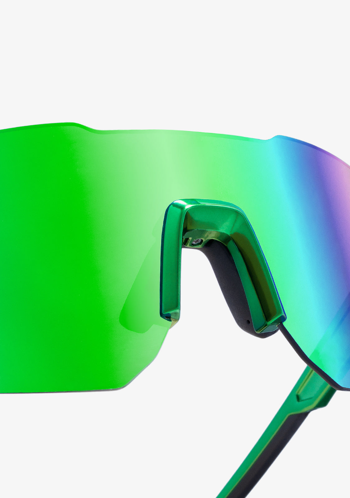 Spiegelnde Sonnenbrillen mit High-Tech-Ästhetik. Tauchen Sie ein in ein geschwungenes Design, inspiriert von der Geschwindigkeit der Wellen. Aerodynamische Sonnenbrillen, die Ihren Stil aufbrechen.