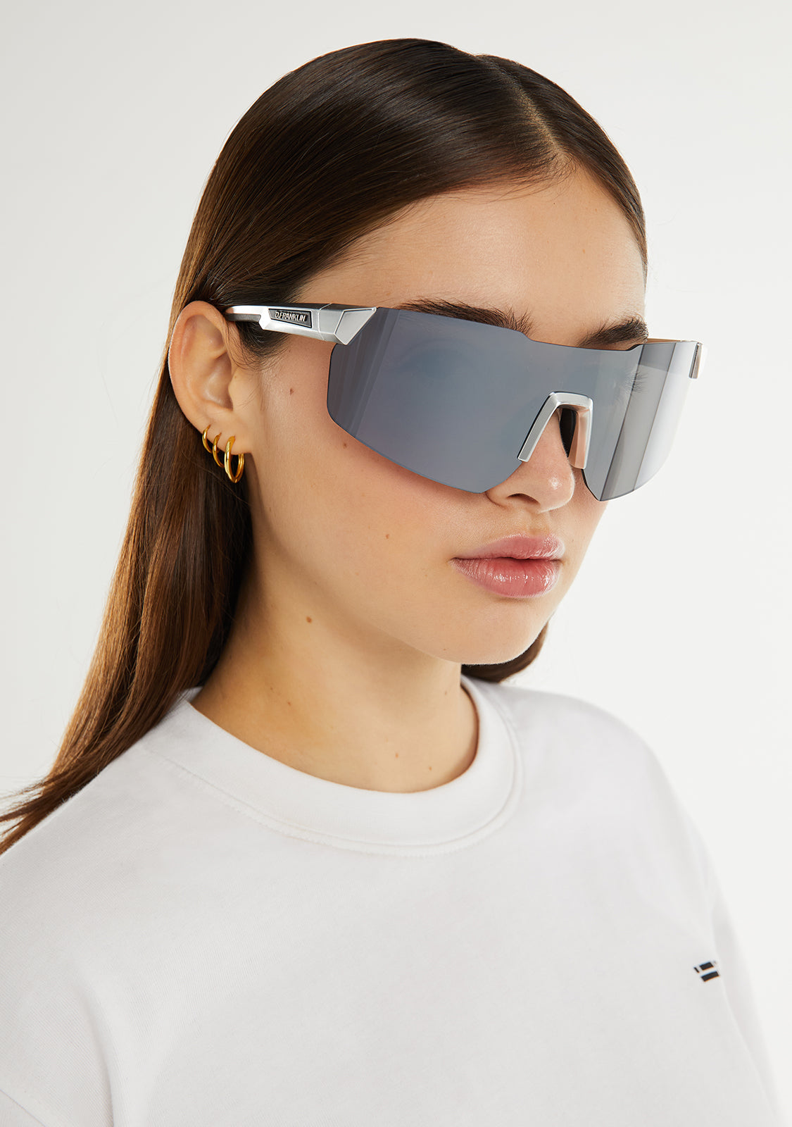 Spiegelnde Sonnenbrillen mit High-Tech-Ästhetik. Tauchen Sie ein in ein geschwungenes Design, inspiriert von der Geschwindigkeit der Wellen. Aerodynamische Sonnenbrillen, die Ihren Stil aufbrechen.