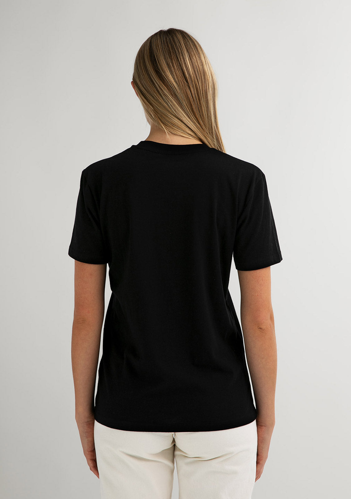 Schwarzes T-Shirt mit kurzen Ärmeln und weißem D.Franklin Logo-Umriss. Vorderseite inspiriert von amerikanischen Colleges und Studentenverbindungen. Rundhalsausschnitt mit doppelter Naht. Hergestellt aus 100% Bio-Baumwolle. Weibliches Modell.