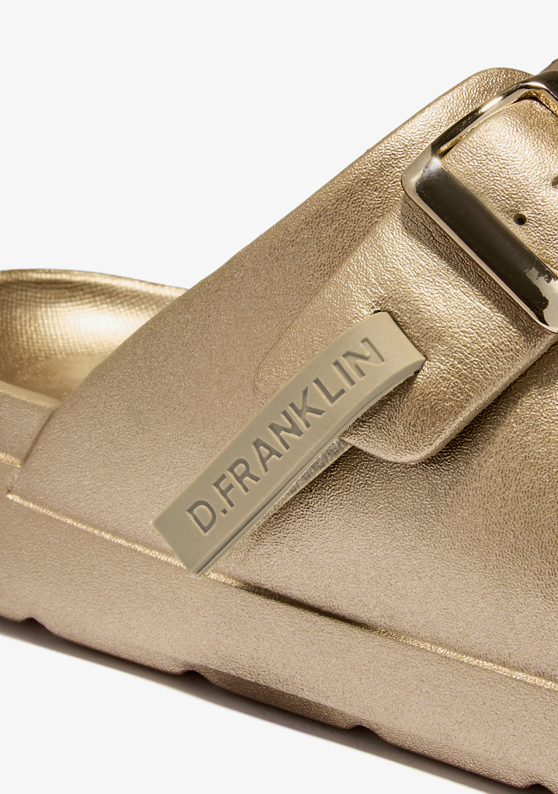 Lernen Sie die Vibe Foam 2 Buckles Met Light Gold kennen, Ihre Lieblingssandalen für den Sommeralltag. Sie bestehen aus leichtem, einteiligem EVA und bieten dauerhafte Dämpfung, Stoßabsorption und einfache Pflege.