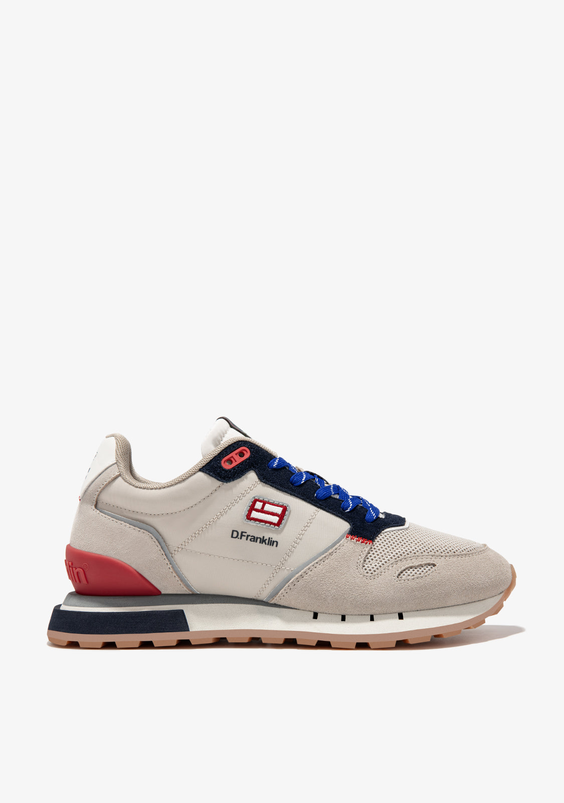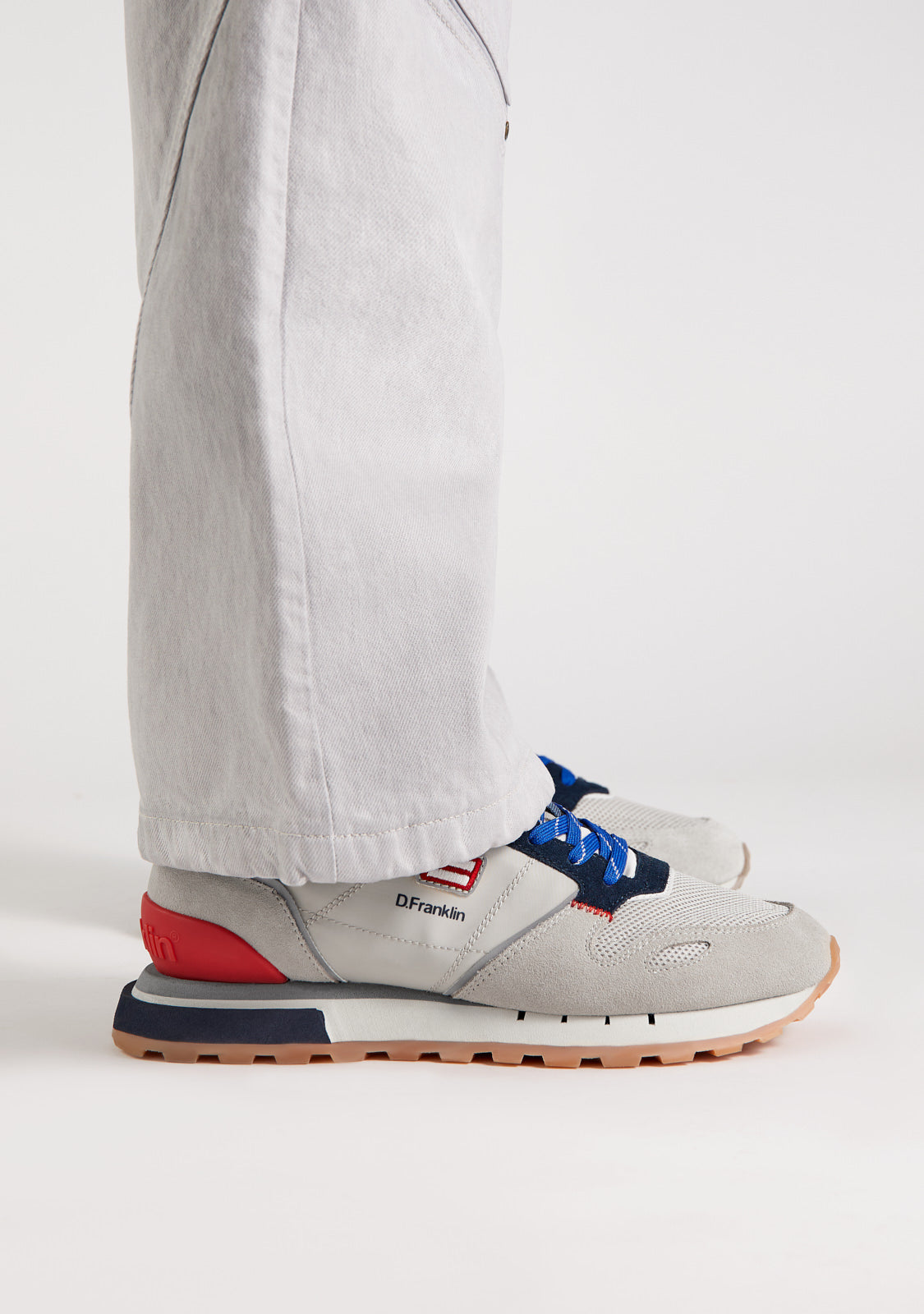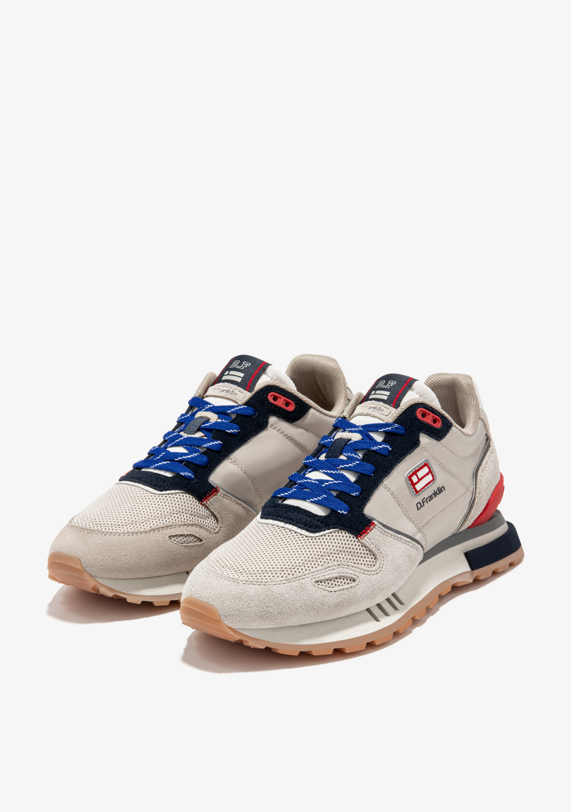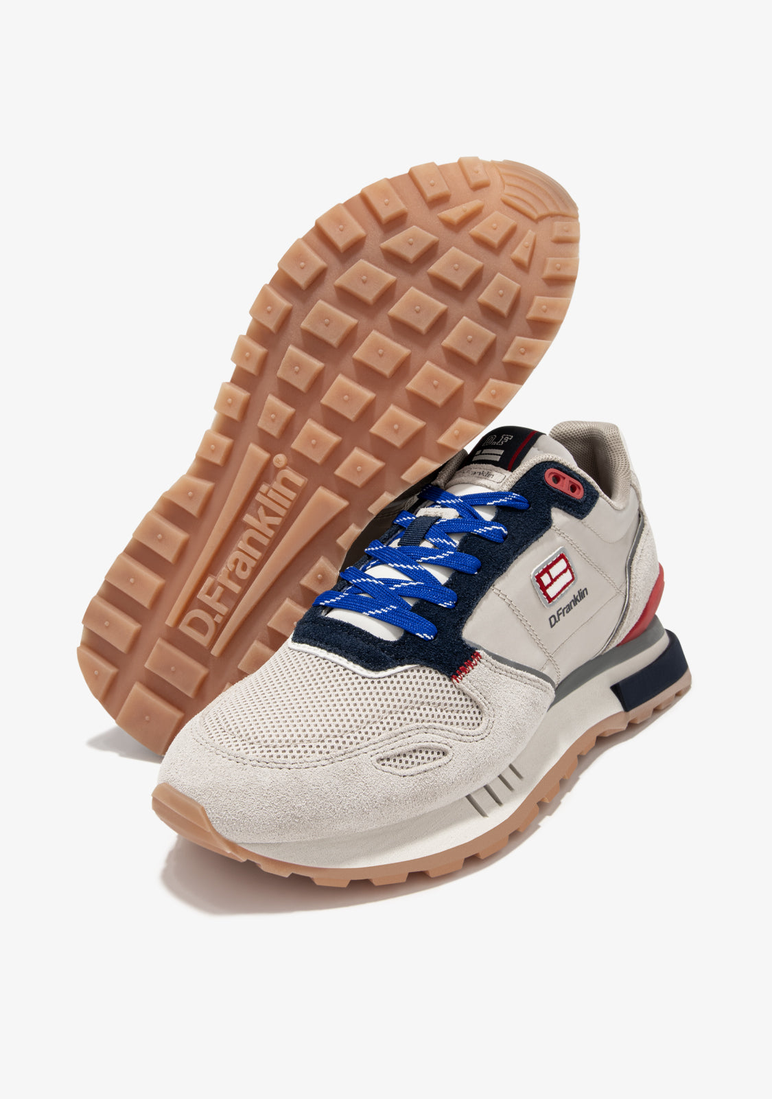 Diese Sneakers sind mit grauen, marineblauen und roten Details gefertigt. Sie verfügen auch über blaue bedruckte Schnürsenkel. Sie haben eine TR-Sohle und eine Pyramidensohle für verbesserten Komfort und Traktion. Der Zehenbereich hat ein gemischtes Zehenstück für zusätzliche Flexibilität. Unser Emblem befindet sich an der Vorder- und Seite sowie auf der Rückseite.
