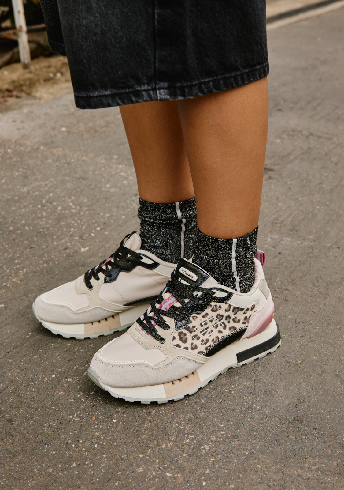 Diese Sneaker sind mit weißen, beigen und rosa Details gefertigt. Sie verfügen auch über ein Leopardenmuster an den Seiten. Sie haben eine TR-Sohle und eine pyramidenförmige Oberfläche für verbesserten Komfort und Traktion. Der Zehenbereich hat ein gemischtes Stück, das größere Flexibilität bietet. Unser Emblem befindet sich an der Vorderseite und an den Seiten sowie auf der Rückseite.
