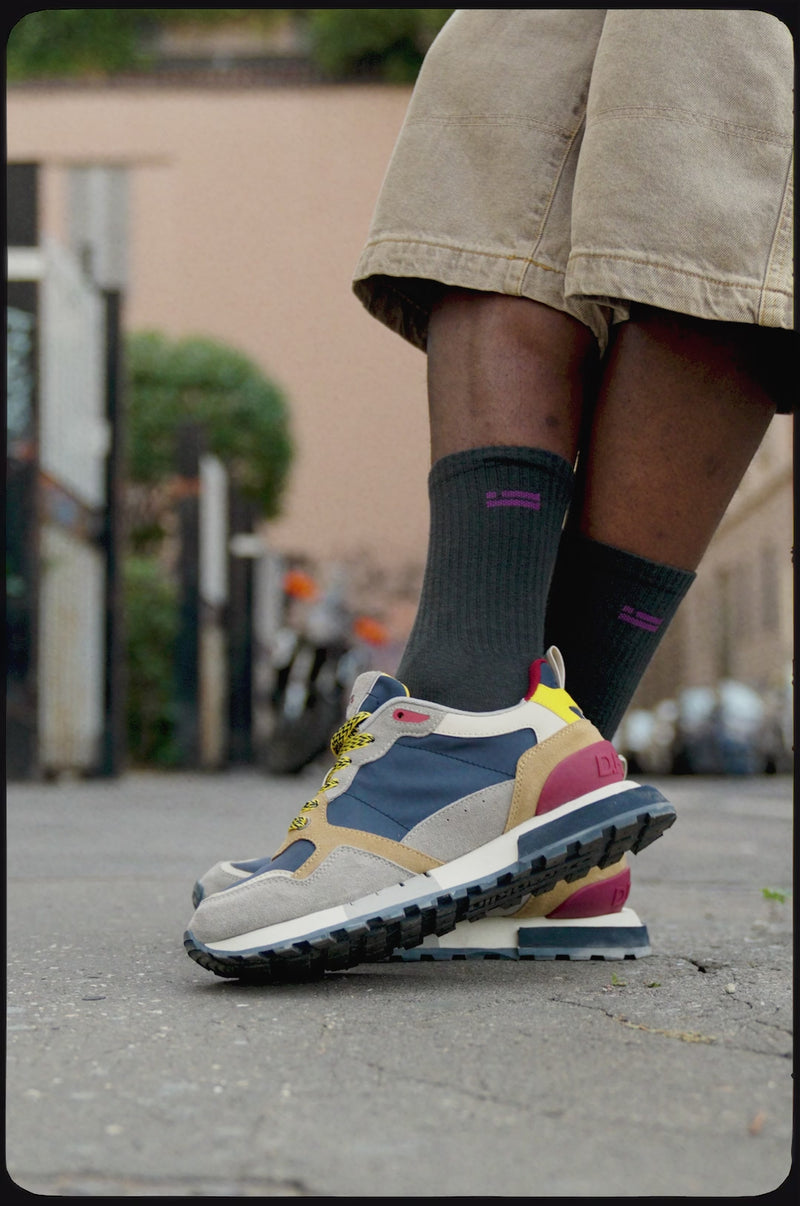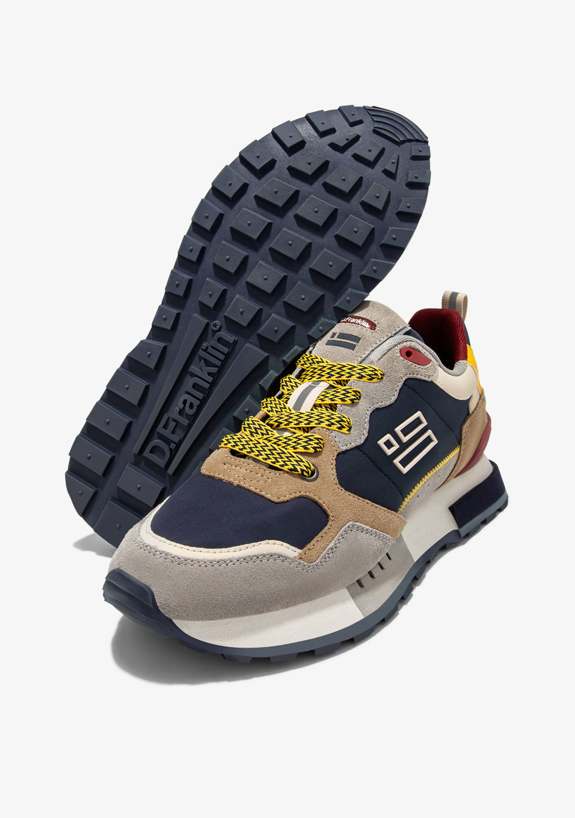 Diese Sneakers sind mit Details in Marineblau, Rot, Gelb und Grau gefertigt. Sie verfügen außerdem über bedruckte Schnürsenkel in Gelb und Schwarz. Sie haben eine TR-Sohle und eine Pyramidensohle für verbesserten Komfort und Traktion. Der Zehenbereich hat ein gemischtes Zehenstück für zusätzliche Flexibilität. Unser Emblem befindet sich vorne und an der Seite sowie auf der Rückseite.