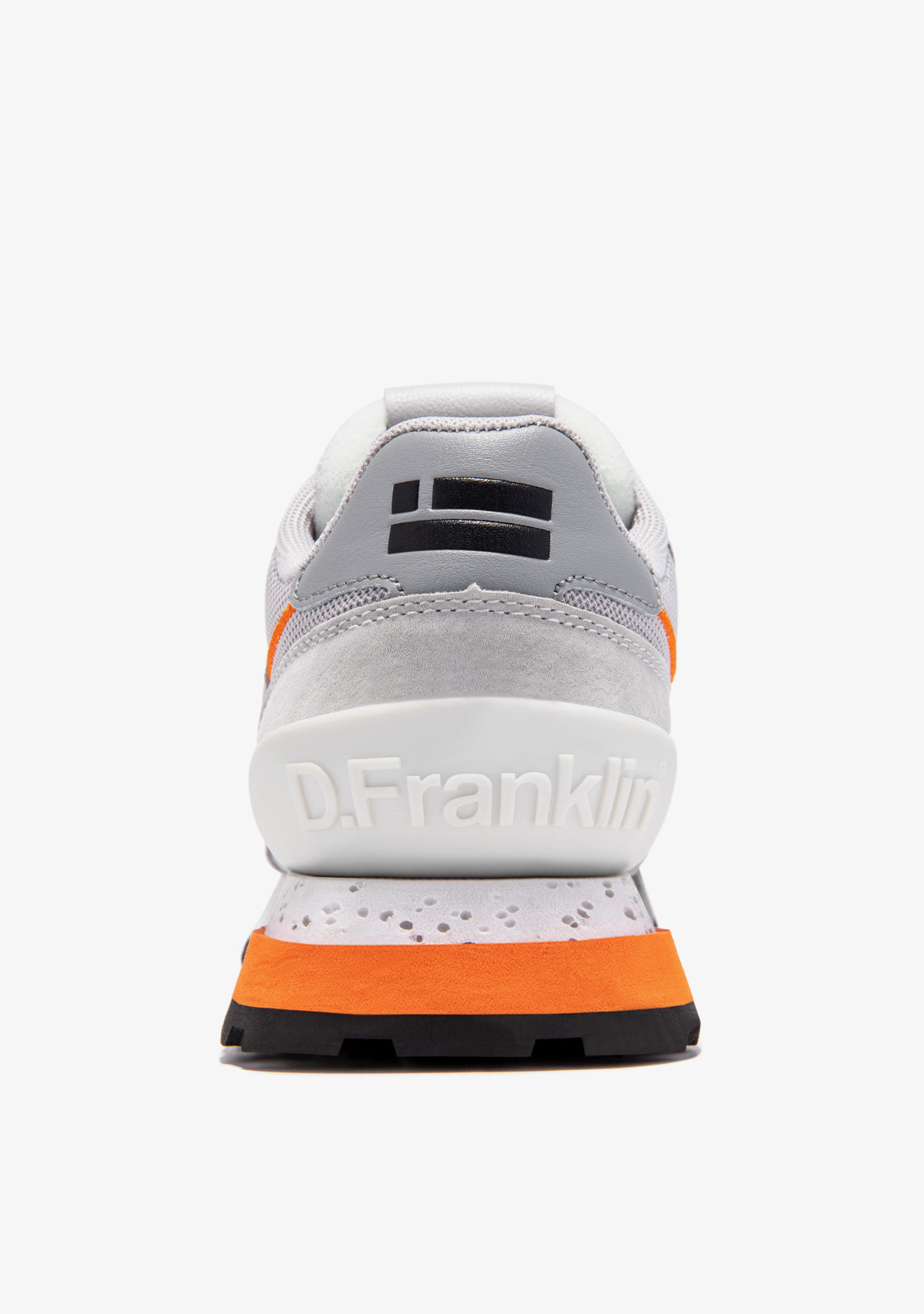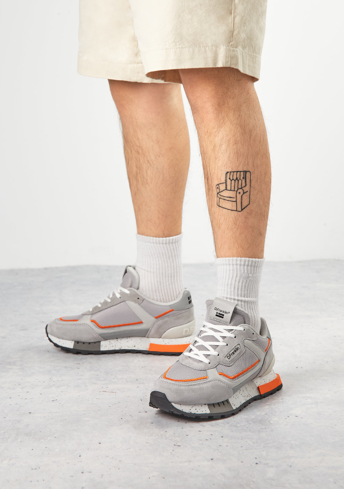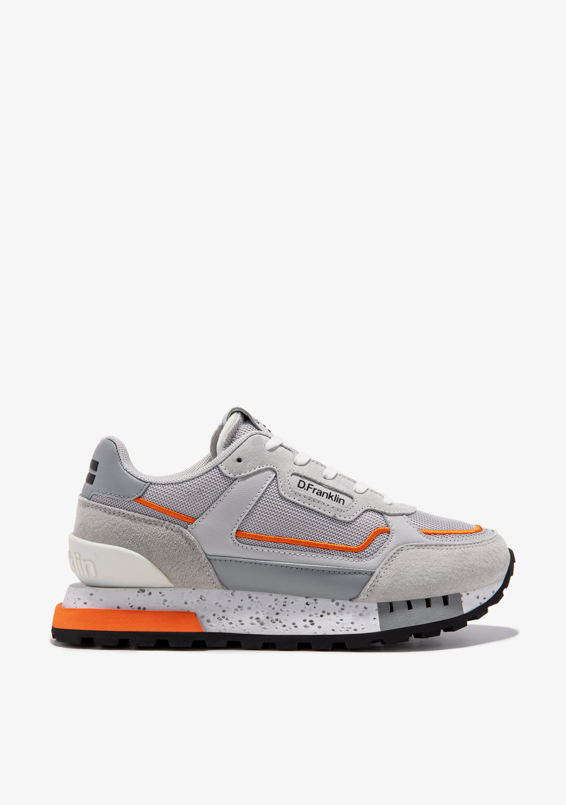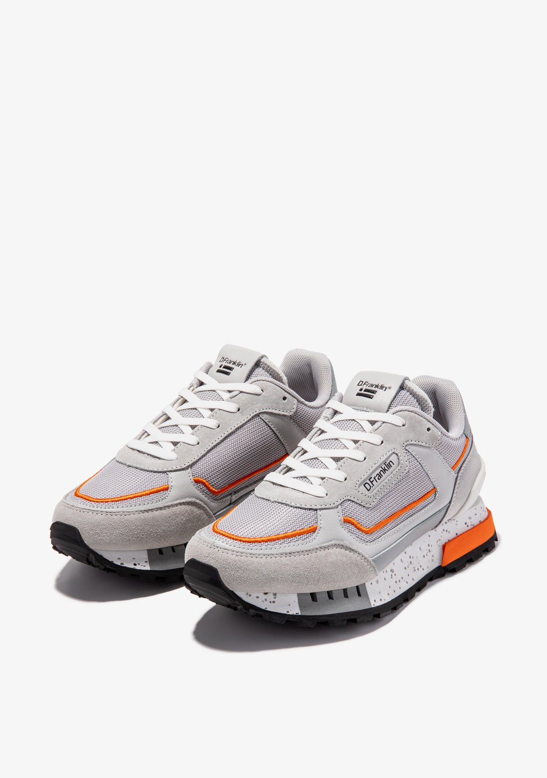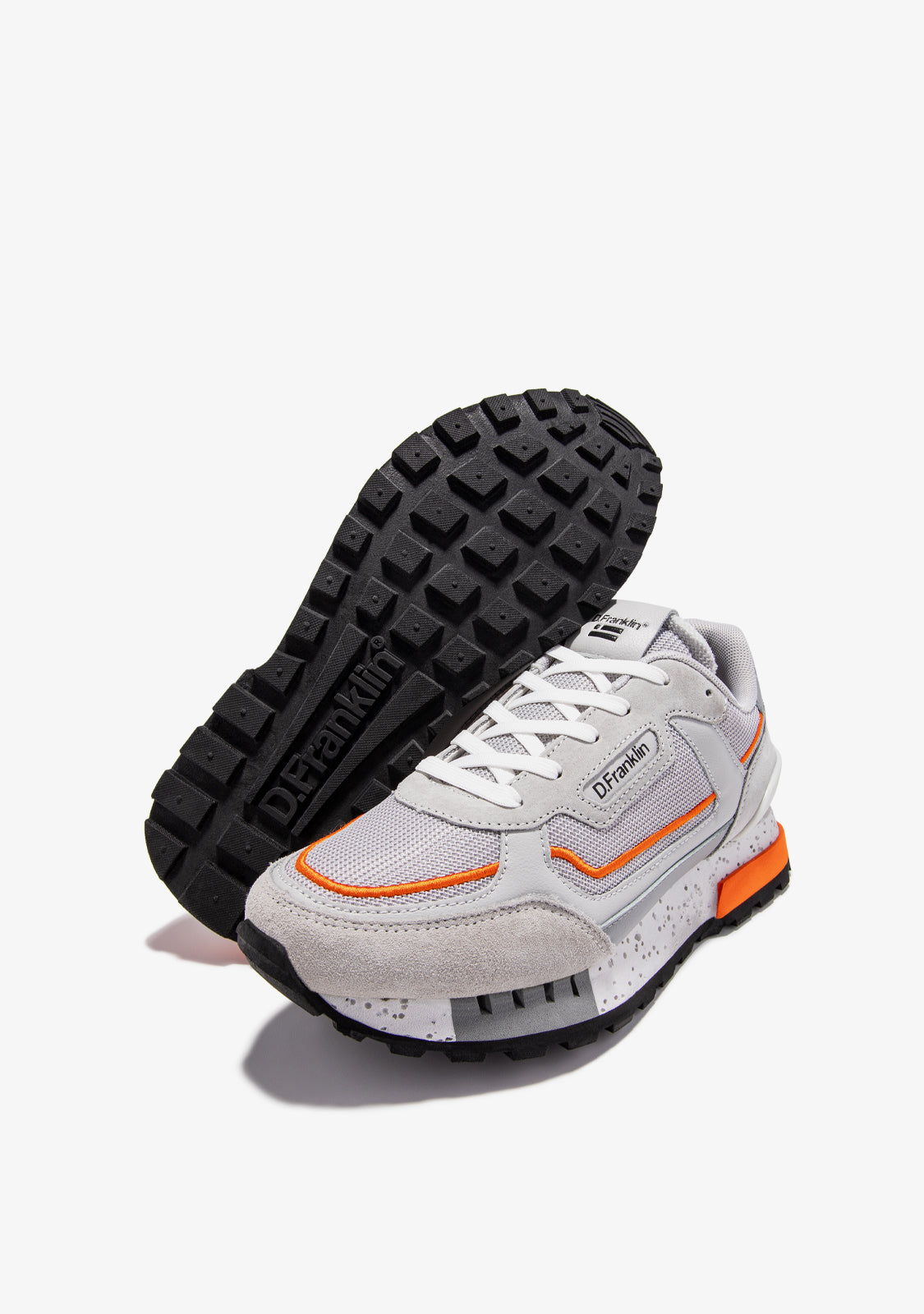 Diese Sneakers sind mit grauen und orangen Akzenten gefertigt. Sie verfügen über eine TR-Sohle mit perforierten Details und einer pyramidenförmigen Oberfläche für verbesserten Komfort und Traktion. Sie haben auch eine gemischte Zehenkappe für zusätzliche Flexibilität. Unser Emblem befindet sich an der Vorder- und Seite sowie auf der Rückseite.
