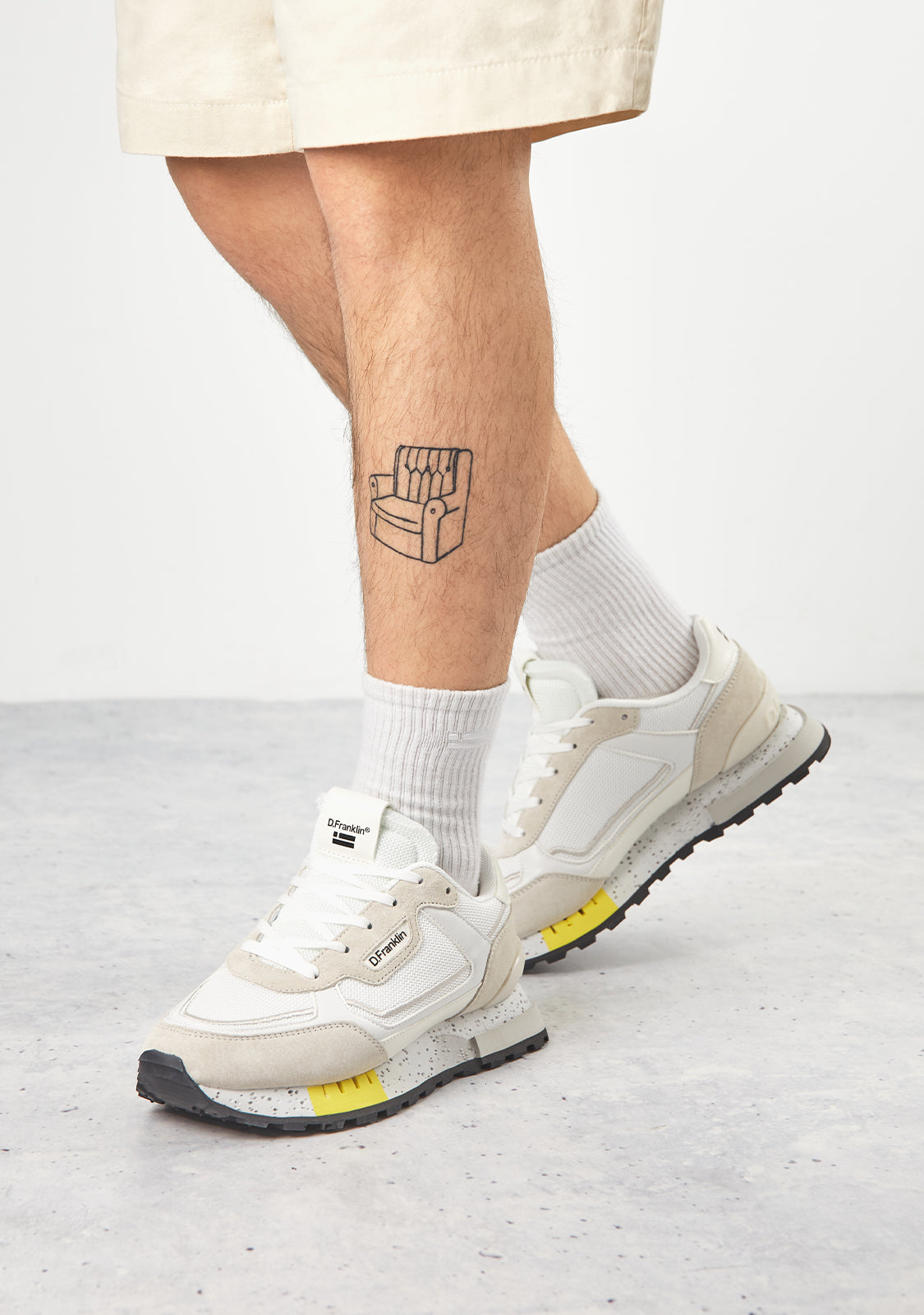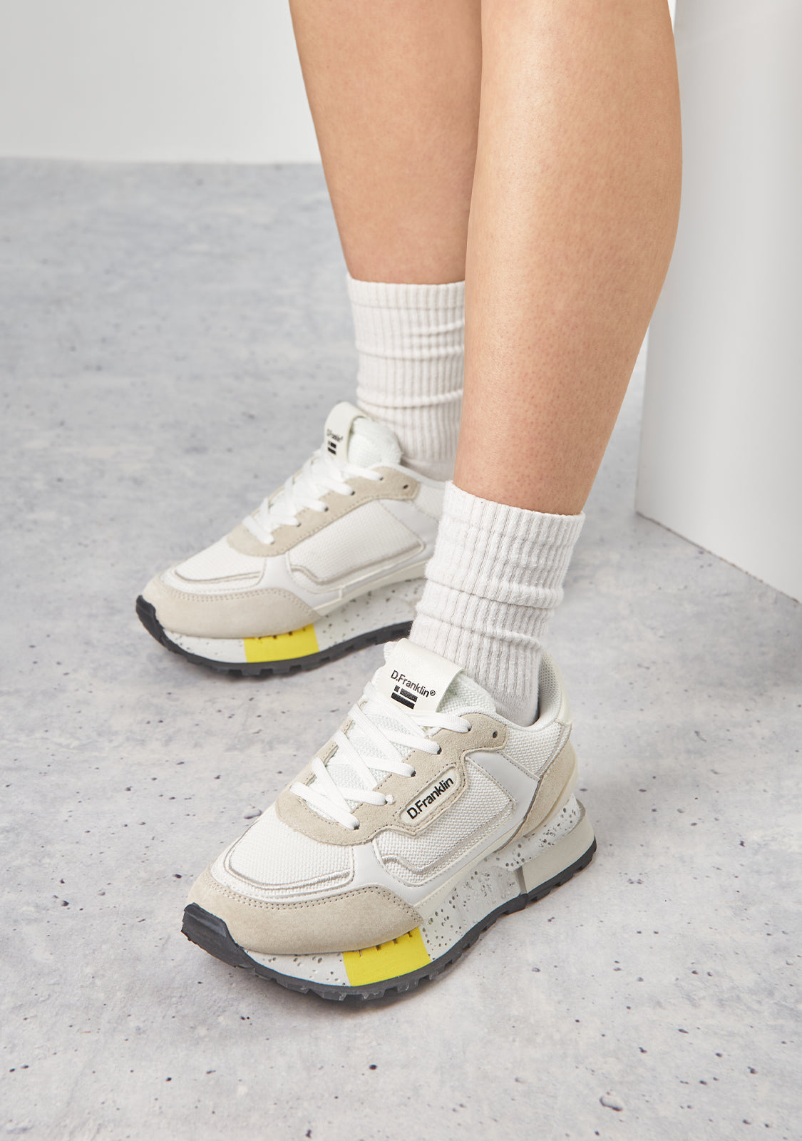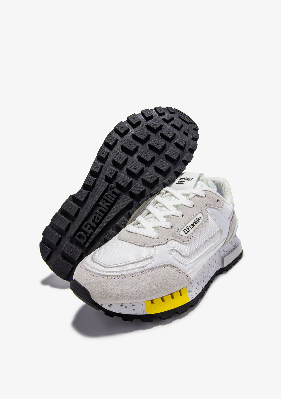 Diese Sneakers sind mit weißen, grauen und gelben Akzenten gefertigt. Sie verfügen über eine TR-Sohle mit perforierten Details und einer pyramidenförmigen Oberfläche für verbesserten Komfort und Traktion. Sie haben auch ein gemischtes Zehenstück für zusätzliche Flexibilität. Unser Emblem befindet sich an der Vorder- und Seite sowie auf der Rückseite.