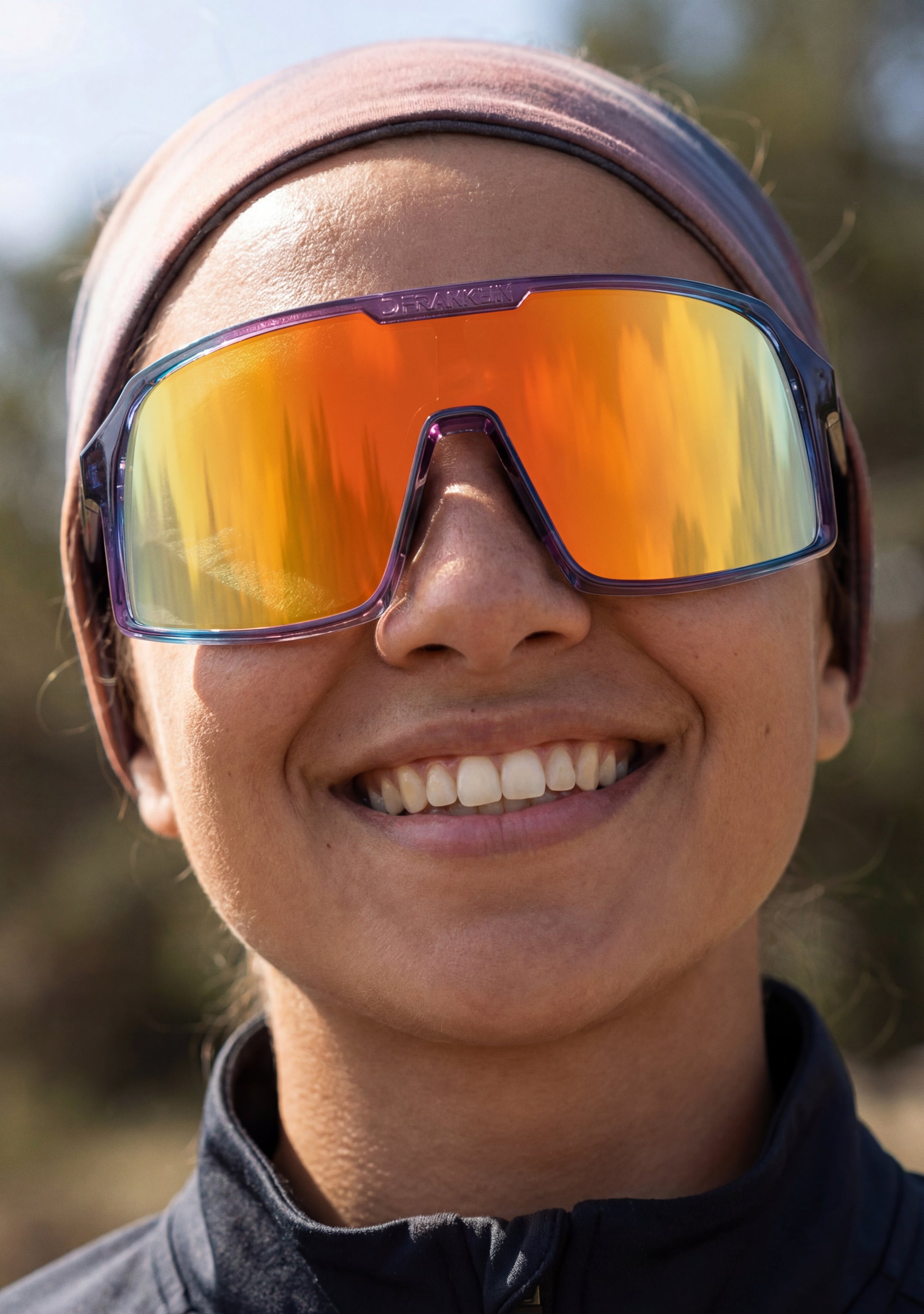 Das Wind Modell hat ein violettes Finish und einen aerodynamischen Rahmen, der für Stabilität und Luftfluss entwickelt wurde. Es verfügt über eine 144 mm Front und 138 mm Gläser, die speziell konstruiert sind, um den Windwiderstand zu optimieren. Die 130 mm langen Bügel tragen auf beiden Seiten unser Emblem, während Silikonpads an den Spitzen und am Nasensteg für sicheren und bequemen Halt sorgen.